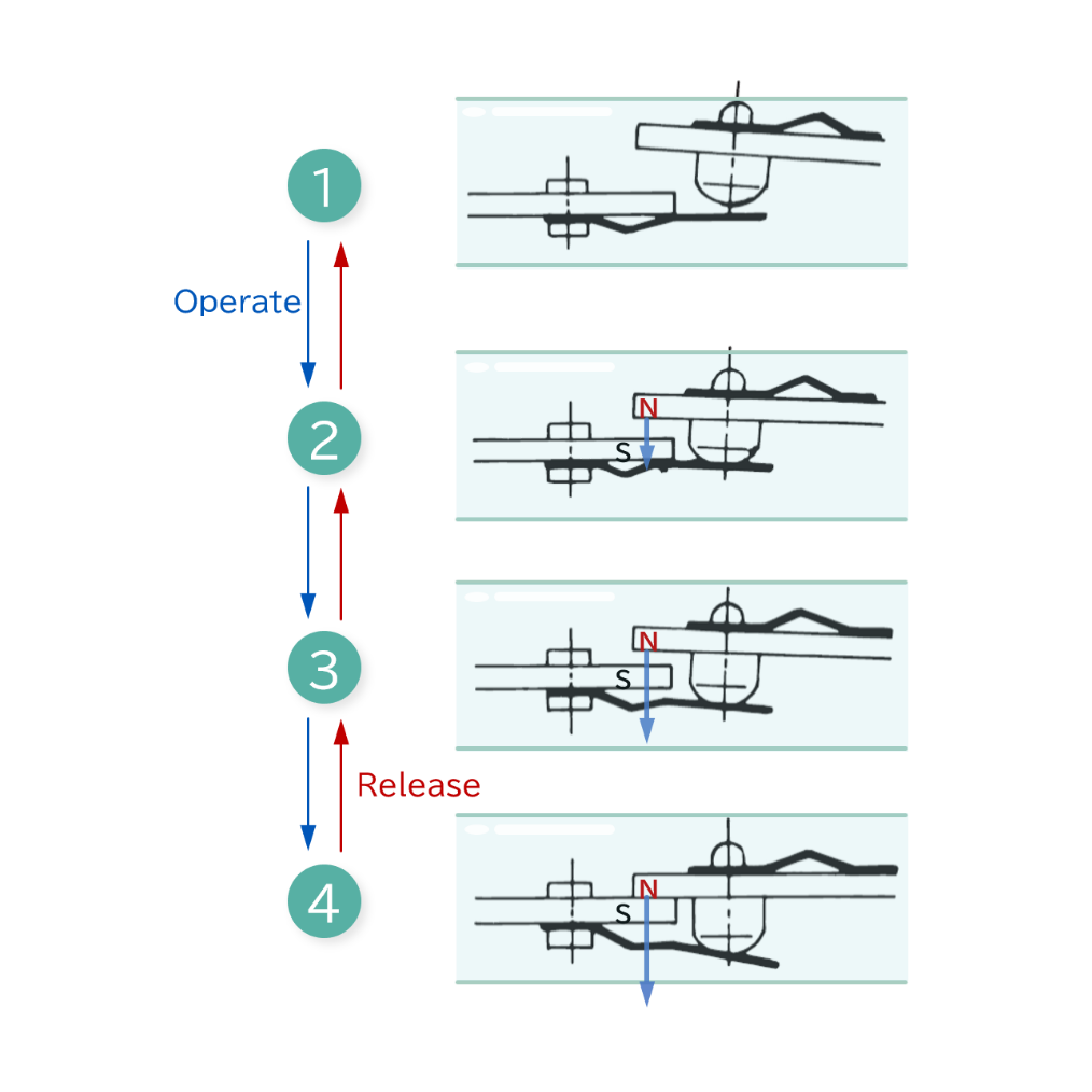 When the pulling force of the contacts is lost, the moving contact is flicked off by the energy of the spring on the fixed contact side when ❸ to ❷.